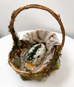 Wicker basket with moss, wrapping paper, water color paint, hand towel